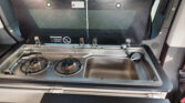 – Bloc cuisine amovible : Evier et réchaud 2 gaz, réserve eau propre / eau sale, bouteille gaz R904 ou R907
